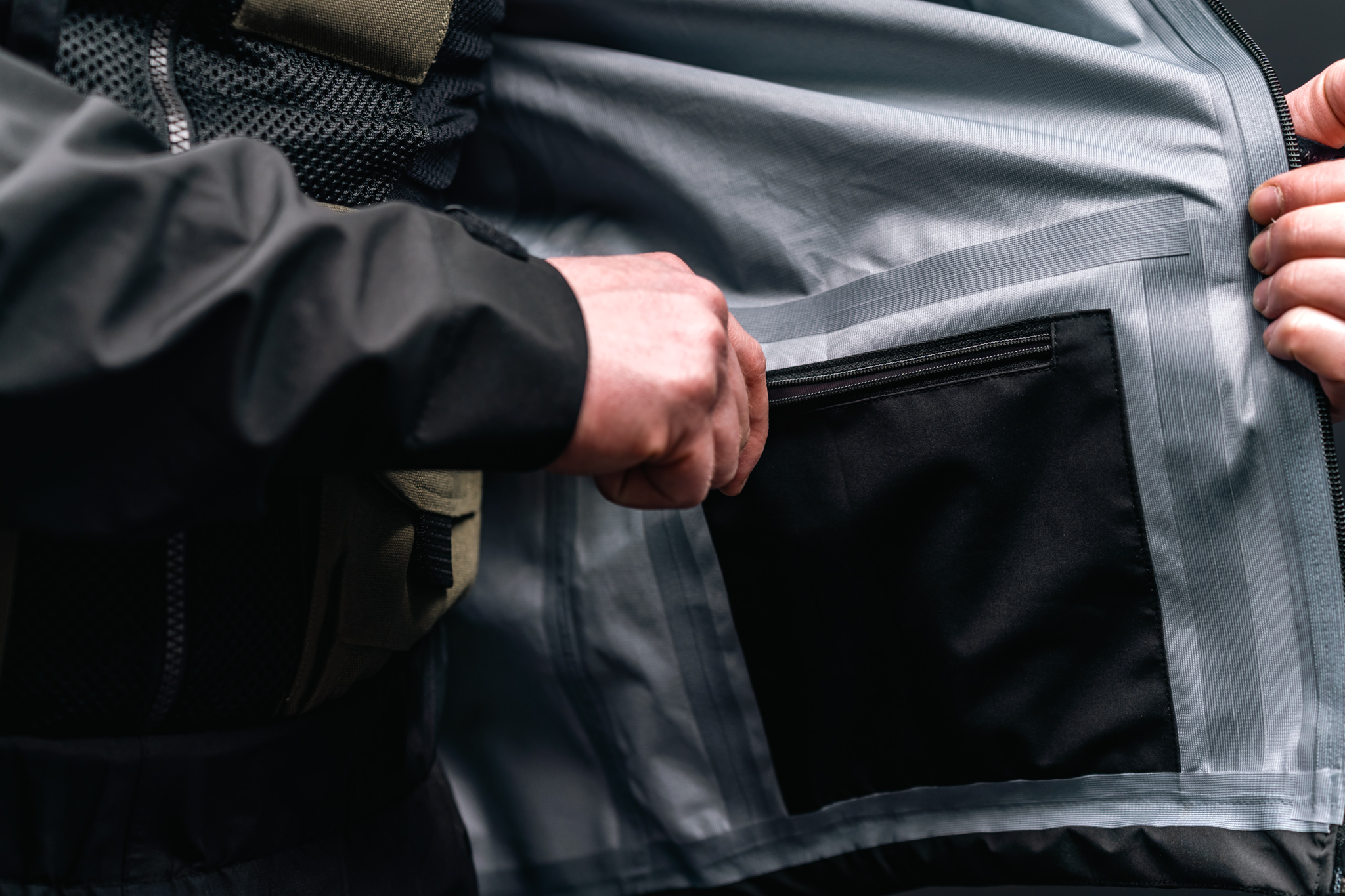 - High performance polyester tri-laminate fabric with waterproof and breathable 15K membrane.