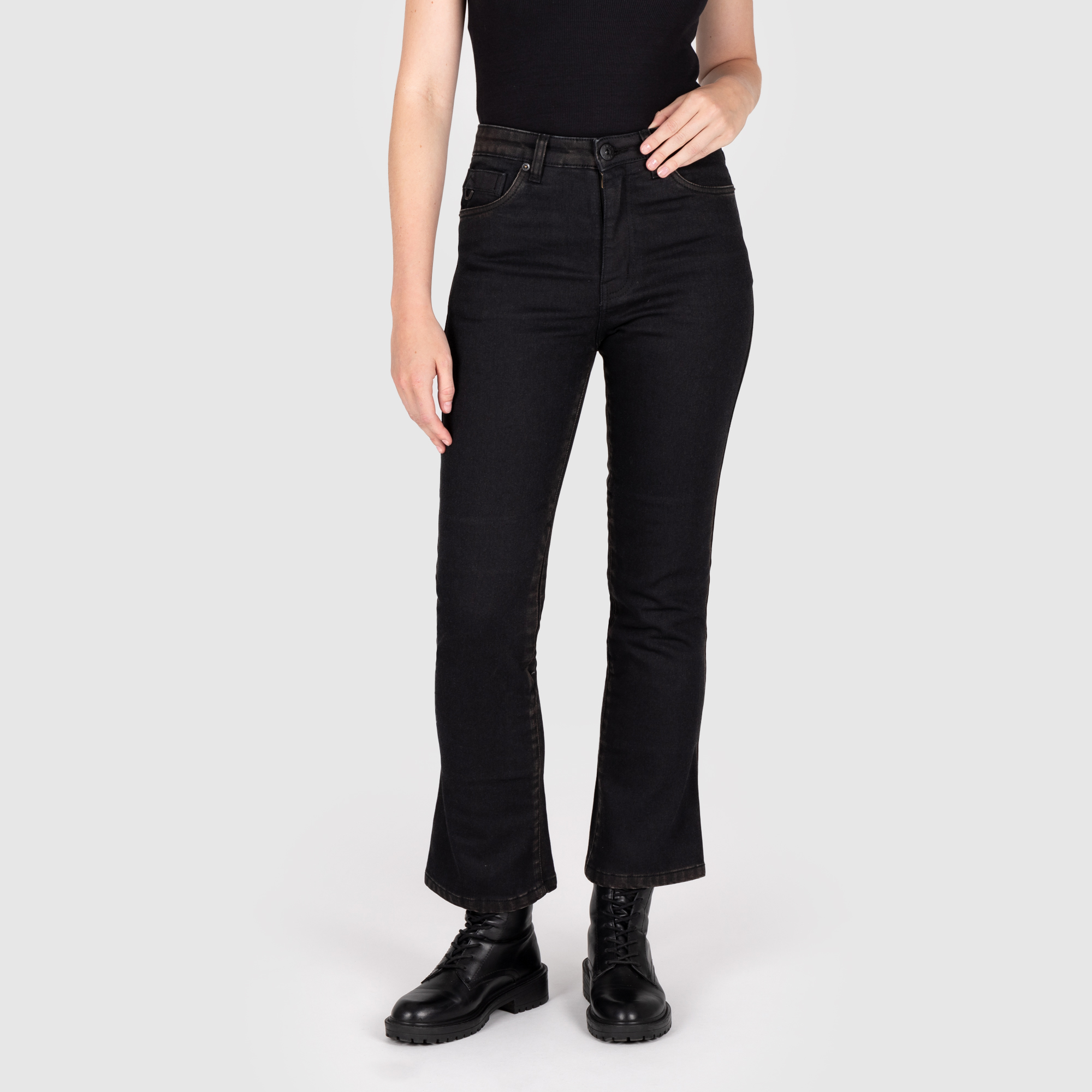 The Cartmel Jeans in aged black rust are Knox’s most flattering, stylish and comfortable jeans yet. They are a single-layer Class AA two way stretch jeans, in a high-waisted kick flare – developed by women for rider’s who are uninspired by the lack of different variations in women’s motorcycle jeans. Made with new advanced abrasion-resistant denim, the Cartmel jeans provide superior protection whilst not compromising on comfort and most importantly, a flattering fit.