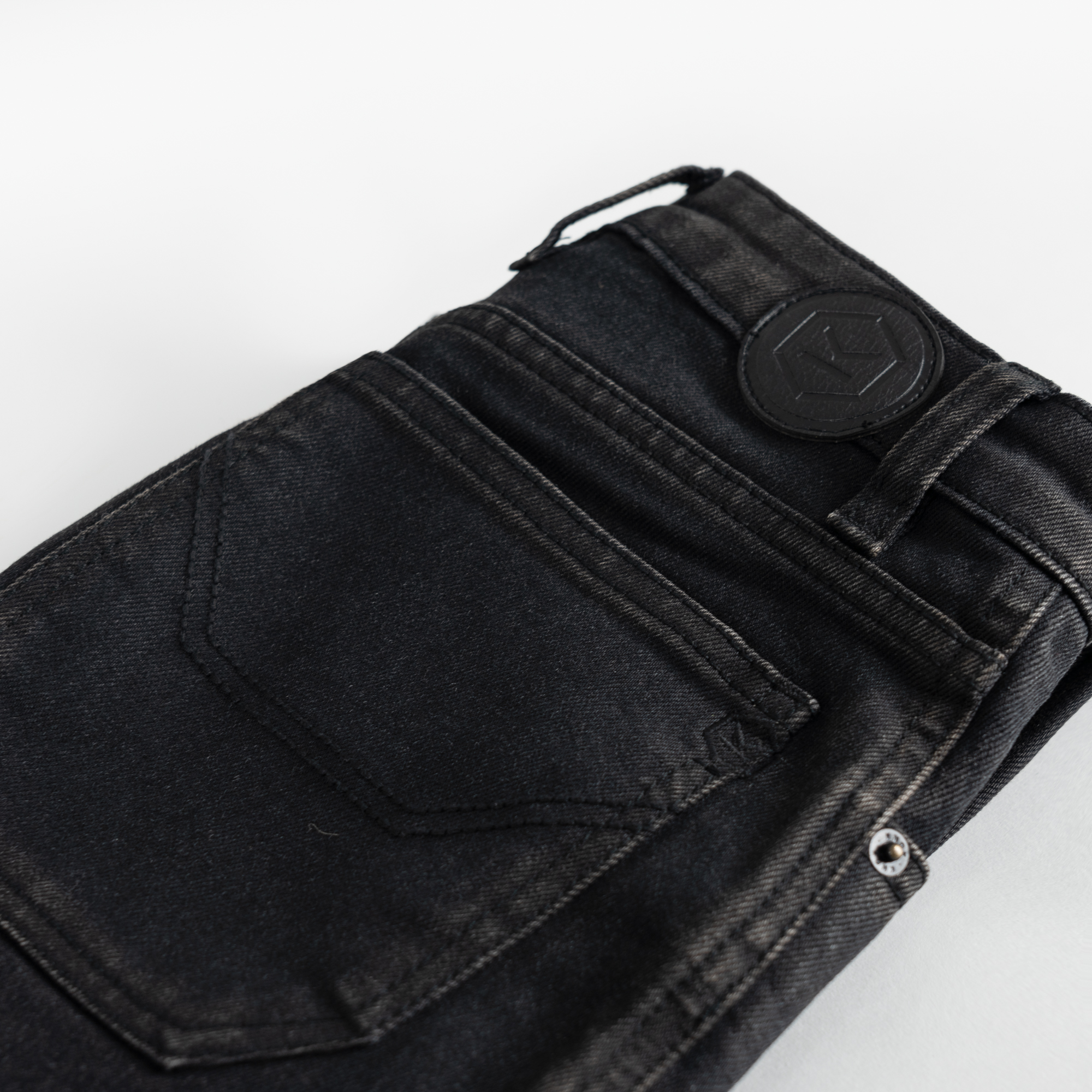 Not only does the new and improved denim give superior comfort, the Cartmel Jean’s brand new kick flare leg for 2025 has been developed especially for women riders. These are still slim fitting, streamlined jeans but with a slight kick flare that offers women riders a more fashionable option than the regular skinny leg motorcycle jeans on the market. The kick flare pairs perfectly with a tall motorcycle boot and has been designed to balance and complement the rider’s figure. The Cartmel Jeans come in an aged black rust wash complete with all-new dark antique brass trims, inspired by the Lake District, which Knox calls home. No stone has been left unturned during the design process and the Cartmel Jeans are full of sophisticated design details on the inside and outside. Featuring an embroidered Knox logo at the back pocket, as well as a circular debossed badge applied to the waistband – subtle branding is present throughout the jeans that has been specifically designed to complement the style. All Knox jeans come with Knox’s unique hexagon shaped keyring for the rider to attach their keys and keep secure. Inside the armour pockets and fly, the rider will find a beautiful abstract print in charcoal colours, which makes gearing up in the Cartmel Jeans a delight.